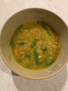 Another secret to good soups besides broths or meat stocks is the use of spices. Turmeric, coriander, and miso give this simple soup full flavor even when you use water instead of broth. I always keep onions, garlic, carrots, celery, potatoes along with Miso Master Chick Pea miso on hand so that I have lots of options when I am using up leftovers. Also, you’ll have more options if you keep frozen vegetables in your freezer; I had a lot of green beans from the garden last year so I froze quite a few bags. All that said, it was the leftover rice that inspired this recipe!