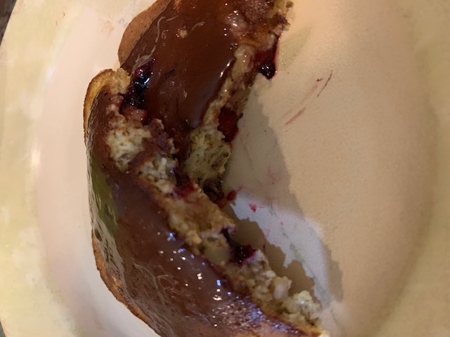 Heat a skillet over medium heat. Add a little ghee just to grease the bottom lightly–use a spatula to spread evenly. As soon as the pan is hot, spoon 2-3 Tbsp. of batter per pancake. Immediately place 6 or so blueberries on each pancake and a few walnut pieces if desired. Adjust the heat down if necessary so the pancakes do not burn–3-5 minutes per side usually does it in my pan. When you see little bubbles forming on the outside it’s time to flip them. If desired, place a few chocolate pieces or chocolate chips on the top after flipping–they will melt while that side down cooks. Gently spread the melted chocolate over the top. Place on a plate and top with a tsp. of ghee and some honey if desired. A 1/2 tsp of honey per pancake is all it takes to sweeten these up. Serve while warm.